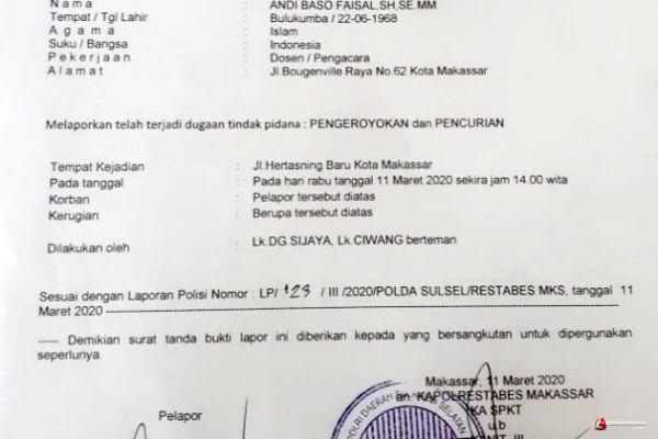 Karena kejadian tersebut, Andi Baso melaporkan kejadian ke Polrestabes Makassar dengan nomor laporan STPL/123/III/2020/POLDA SULSEL/RESTABES MKSR. Rabu, (11/3/2020) terkininews.com
