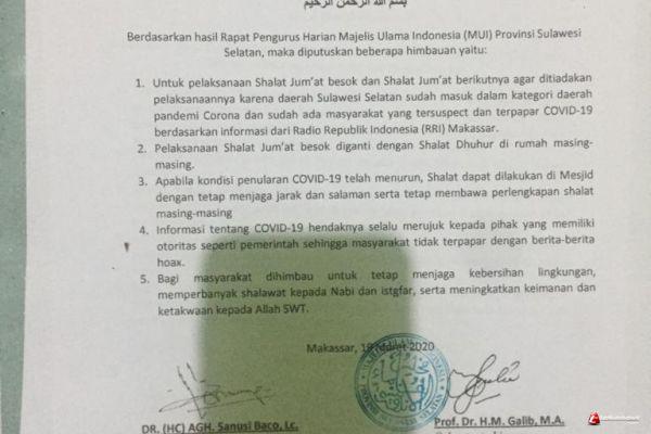 Diketahui, surat edaran MUI Sulsel ditandatangani langsung Ketua Umum, AGH Sanusi Baco Lc, dan Sekretaris Umum, Prof Dr HM Galib MA. Salah satu point dalam imbauan tersebut terkait dengan pelaksanaan Shalat Jumat yang akan dilaksanakan hari ini, 20 Maret 2020 dan Shalat Jumat berikutnya agar ditiadakan pelaksanaannya karena Sulsel sudah masuk kategori daerah pandemi corona dan sudah ada yang positif Covid-19.