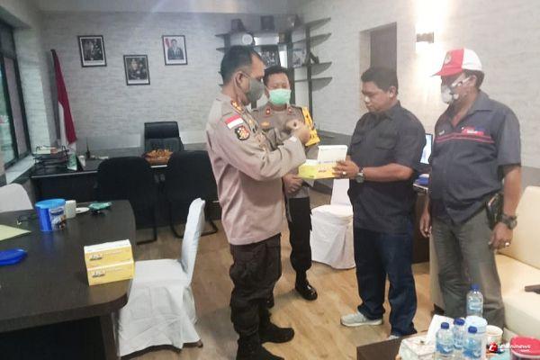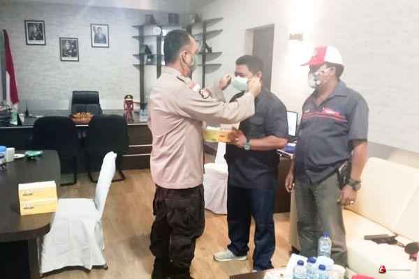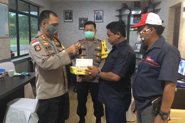 Penyerahan bantuan APD pada jurnalis di serahkan secara langsung oleh Kapolres Lingga, AKBP Boy Herlambang yang di dampinggi Waka Polres Lingga Kompol, M Tahang dan Kasat Reskrim Polres Lingga, AKP Rangga Primazada di Mapolres Lingga Kamis (23/4/2020).