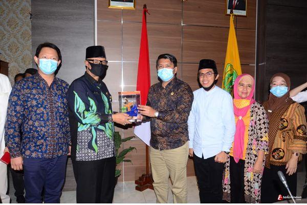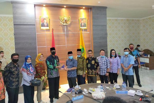 LINGGA - Rombongan anggota Dewan Perwakilan Rakyat Daerah (DPRD) Kota Tanjungpinang menyambangi Kantor Bupati Lingga pada Kamis (11/06/2020) pagi. Dalam kunjungan perdana ini, Ketua Komisi I (satu) Novaliandri Fathir bersama 8 orang rekan anggota DPRD lainnya menyampaikan maksud untuk melaksanakan studi banding terkait upaya Pemkab Lingga dalam menangani status tanggap darurat Covid-19 serta melakukan studi terkait Pengawasan Satpol PP dalam masa Pandemi seperti saat ini. Selain itu, salah satu sebab yang menjadi daya tarik kunjungan tersebut adalah predikat Zona Hijau yang disematkan kepada Kabupaten Lingga ditengah masa pandemi Covid-19 saat ini, serta bagaimana bisa menjadi demikian.