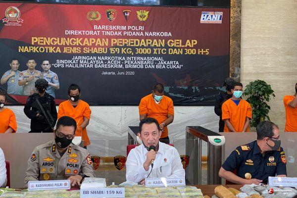 JAKARTA, -- Direktorat Tindak Pidana Narkoba Bareskrim Polri berhasil mengungkap sindikat peredaran narkoba jaringan Malaysia - Aceh - Pekanbaru - Jakarta. Dittipid Narkoba bekerja sama dengan bea cukai dan Brimob Polri untuk melakukan operasi dengan sandi ”Ops Halilintar 2020” di wilayah operasi di perairan Aceh dan perairan Selat Sunda Pantai Selatan Pulau Jawa.