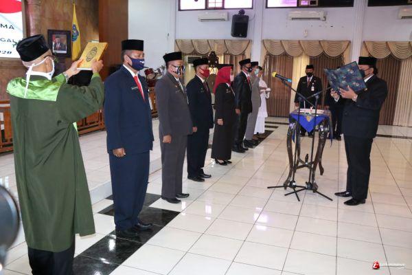TEGAL, - Walikota Tegal, H. Dedy Yon Supriyono, SE, M.M secara langsung melantik dan mengambil sumpah kepada enam pejabat tinggi pratama baru di lingkungan Pemerintah Kota Tegal, hal ini terlaksana pada saat Upacara Pelantikan dan Pengambilan Sumpah Jabatan Tinggi Pratama di Lingkungan Pemerintah Kota Tegal, 8 Juli 2020 di Gedung Adipura Komplek Balaikota Tegal.