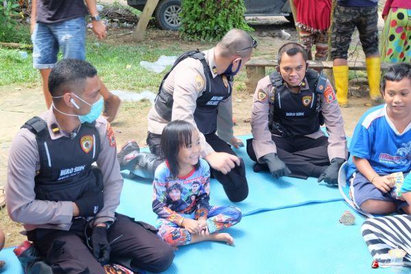 MASAMBA, -- Tim Trauma Healing POLDA Sulsel Datangi 4 Posko Pengunsian di Masamba Memberi motivasi dan bantuan logistik kepada korban bencana banjir bandang. di jalan Lingkar Desa radda kec Masamba, Luwu utara,