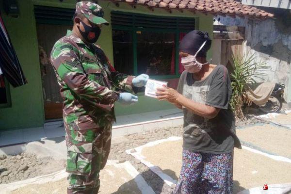 Tampak Sertu Anang Jatmiko, salah satu Babinsa Koramil Bumiayu, memberikan masker secara door to door kepada warga desa tersebut.