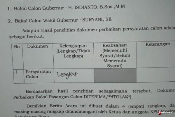 "Rabu sore tadi sudah kami serahkan berkas yang kurang hanya satu dan sudah ada tanda terima kelengkapan berkas juga yang ditandatangani seluruh komisioner KPU Kepri," kata Bambang Dipoyono.