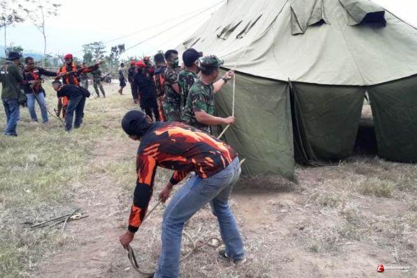 Tampak mereka bersama anggota Kodim 0713 Brebes, mendirikan tenda peleton TNI di Lapangan Sepakbola Kalinusu, yang akan digunakan sebagai sarana penunjang upacara pembukaan TMMD Reguler pada 22 September 2020 nanti. Kamis (17/9/2020).