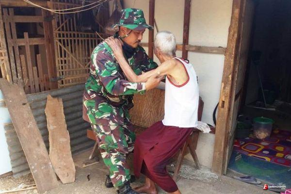 Amatan awak media, Babinsa Serda Muarif, Satgas TMMD Yang Membantu Warji (75) Sedang Beristirahat sembari melihat sasaran fisik Program TMMD rehab RTLH rumah nya.