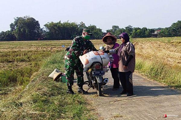 Salah satu anggota Satgas TMMD Sendangkulon yang kebetulan melintasi jalan pertengahan sawah itu merasa senang bisa membantu warga,ibu ibu mengangkat hasil panen dari sawah yang membutuhkan pertolongan.