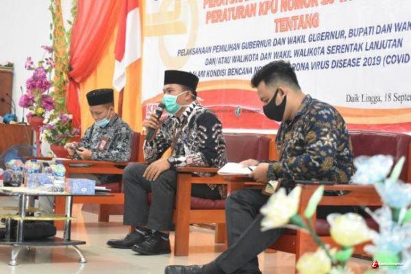 LINGGA - Komisi Pemilihan Umum (KPU) Lingga mensosialisasikan Peraturan KPU (PKPU) Nomor 6 Tahun 2020 junto PKPU Nomor 10 Tahun 2020 yang menjadi landasan hukum dan protokol kesehatan virus Corona kepada stakeholder pemilihan serentak tahun 2020, di Aula Hotel Lingga Pesona, Daik, Jumat (18/9/2020).