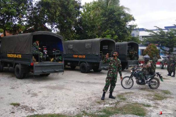 Tampak sejumlah sepeda motor juga diangkut di mobil truk pasukan, saat melaksanakan transit dan pengecekan kekuatan personel di Makoramil 08 Bumiayu, Jalan Pangeran Diponegoro No. 141. Selasa (22/9/2020).