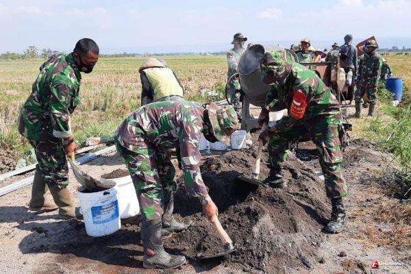 Salah satu anggota Satgas TMMD Serda Juwanto disela meratakan adukan cor meneriakkan, hari libur tetap lembur tanpa kendur.
