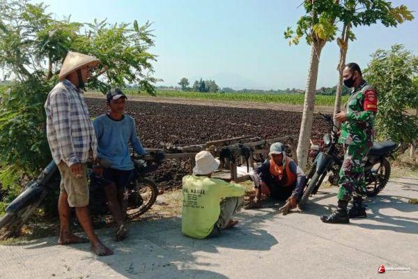 Seperti yang dilakukan anggota satgas TMMD saat istirahat kerja menyempatkan diri untuk bersilaturahmi dengan para petani yang ada di desa Sendang Kulon, tampak anggota satgas TMMD menemui petani saat berada di sawah.