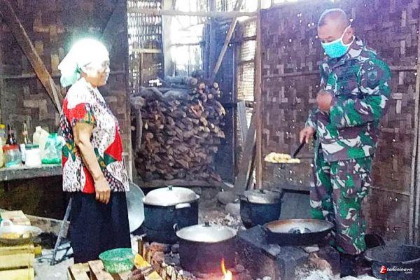 salah satu Anggota Satgas TMMD Kodim 0715 / Kendal,di sela waktu istirahat siangnya mengunjungi Dapur rumah salah satu warga,"Rubiati (61) dan berkomunikasi,serta memberikan contoh hidup yang bersih.