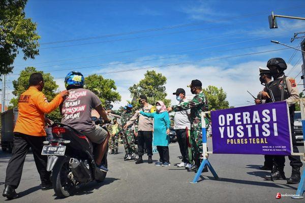 TEGAL – Sedikitnya 39 orang pelanggar protokol kesehatan terjaring razia Satgas Covid-19 dan dikenai sanksi denda administrasi pada operasi yustisi gabungan TNI-Polri dan Satuan Polisi Pamong Praja Kabupaten Tegal. Operasi yustisi tersebut digelar usai dicanangkannya Peraturan Bupati Tegal Nomor 62 Tahun 2020 oleh Bupati Tegal Umi Azizah di halaman Detasemen Zeni Bangunan (Denzibang) 1/IV Diponegoro, Slawi, Jumat (25/09/2020) pagi.