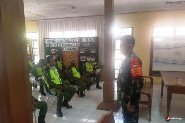 Danramil 01/Kendal Kapten Inf Agus Sulistyo yang tergabung dalam tim Satgas TMMD Kodim 0715/Kendal melaksanakan pembinaan anggota Linmas di Balai Desa Sendang Kulon, Kecamatan Kangkung (desa sasaran TMMD). .