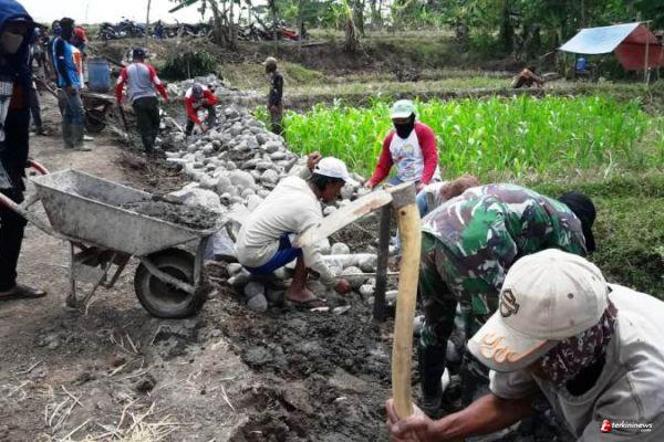 BREBES – Progres 60 persen pekerjaan pembangunan talud di kanan kiri jalan antar dusun/dukuh di Desa Kalinusu, Kecamatan Bumiayu, Kabupaten Brebes, Jawa Tengah, juga ada campur tangan dari tangan terampil Sertu Sudirso, salah satu anggota Tim Teknisi Bangunan Kodim 0713 Brebes.