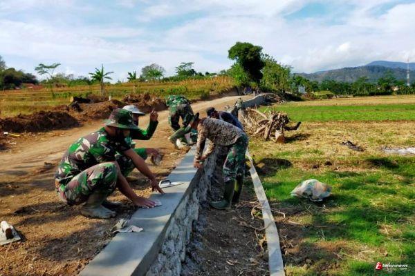 Seperti terlihat saat ini, Koptu Harlin, anggota Satgas TMMD Reguler dari Yonif 407 Padma Kusuma, bersama rekan-rekannya sedang bekerja di sasaran talud yang dibangun di kanan kiri jalan TMMD sepanjang 2,2 kilometer lebar 4-6 meter itu. Senin (28/9/2020).