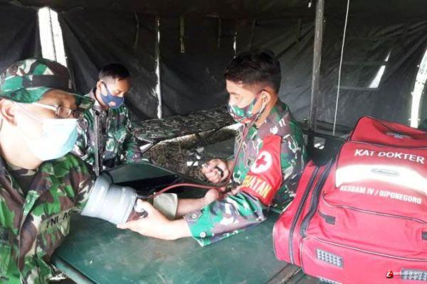 BREBES – Tim Kesehatan Denkesyah 04.04.01 Purwokerto dari Klinik Pratama Kartika 13 Brebes, melakukan pemeriksaan kesehatan secara berkala kepada anggota Satgas TMMD Reguler 109 Kodim 0713 Brebes, di tempat pemusatan tinggal mereka, di tenda-tenda pleton yang didirikan di Lapangan Sepakbola Desa Kalinusu, Kecamatan Bumiayu, Kabupaten Brebes, Jawa Tengah.