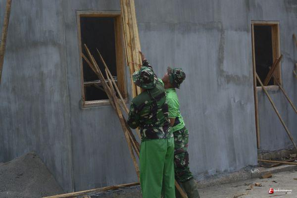 LAMONGAN ,- pengerjaan rumah isolasi dalam tahap pemasangan kerangka yang nantinya untuk penopang asbes atap rumahnya. para satgas TMMD 109 cekatan turunkan kayu dari kendaraan.