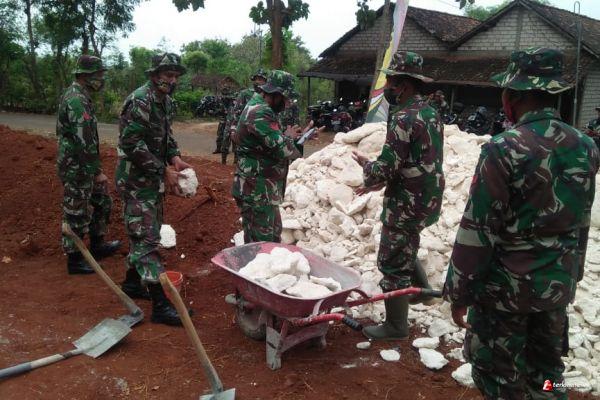 LAMONGAN — Kerta dorong mini yaitu Angkong sangat berguna untuk melangsir material berupa pasir maupun bahan bangunan di tempat yang sempit yang tidak bisa di lalui truk di lokasi TNI Manunggal Membangun Desa (TMMD) ke-109 Kodim 0812/Lamongan yang berada di Desa Tebluru Kecamatan Solokuro Kabupaten Lamongan.