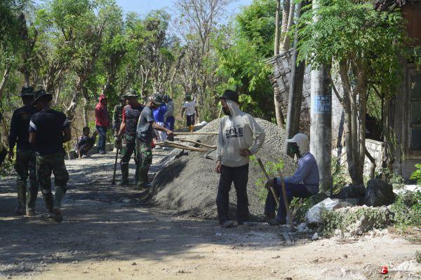 LAMONGAN - Warga dan Satgas TNI Manunggal Membangun Desa (TMMD) terlihat sibuk mengerjakan jalan penghubung dari desa tebluru kecamatan Solokuro menuju Desa Taman Prijet kecamatan Laren.