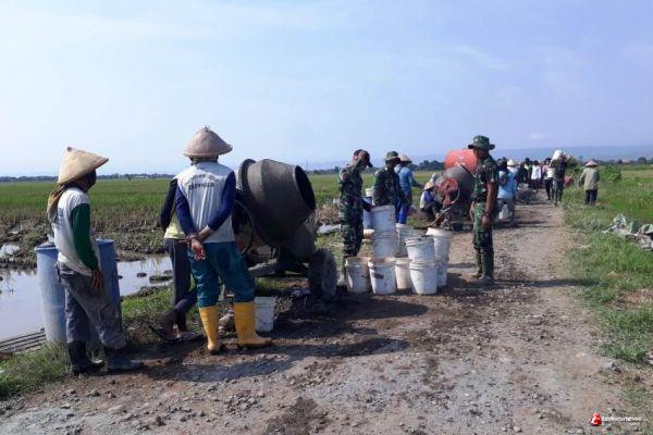 Semangat warga dan TNI sangat kompak, kerja keras demi membangun jalan yang ia impikan selama ini. tumpukan -tumpukan material mulai dati koral , pasir semen mewarnai roda perputaran dalam pembangunan betonisasi jalan.dengan penuh semangat para Satgas TMMD - Reg - 109 dan warga Desa Sendang Kulon,siap mengangkut dan memindahkanTumpukan tumpukan ember yang berisi material.
