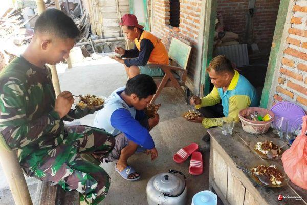Personil Satgas TMMD Reguler 109 Kodim 0715/Kendal makan bersama warga di sela sela pembangunan program RTLH. Layaknya seperti bersama keluarga sendiri, anggota satgas yang membantu rehab Rumah Tidak Layak Huni (RTLH) tersebut menyantap makanan dan minuman yang telah disediakan.di sela sela istirahat mereka larut dalam suasana kebersamaan dan kekeluargaan.