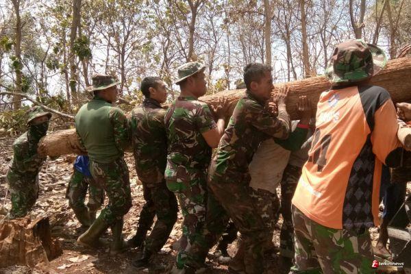 Secara gotong royong anggota Satgas TMMD angkat potongan kayu jati