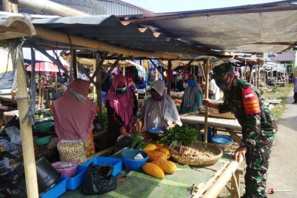 Sibuk di TMMD Reguler, Babinsa Bantarkawung Brebes Himbau Pengunjung Pasar Pakai Masker