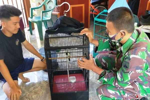 Serda Supriyanto, anggota Satgas TMMD ke 109 Kodim 0715/Kendal di sela sela istirahatnya mengunjungi rumah Irfan (18) yang mempunyai hobi memelihara burung berkicau di Desa Sendang kulon,Kecamatan Kangkung,Kabupaten Kendal.