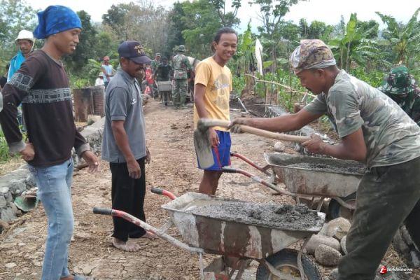 BREBES - Anggota Satgas TMMD Reguler Ke-109 Kodim 0713 Brebes dibantu warga di Desa Kalinusu, Kecamatan Bumiayu, Kabupaten Brebes, seolah berpacu dengan waktu untuk menyelesaikan pengerjaan fisik berupa pembangunan talud di kanan kiri jalan TMMD.