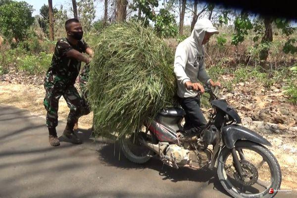 LAMONGAN – Prada Dasuki prajurit TNI Yang tergabung dalam TNI Manunggal Membangun Desa (TMMD) 109 Kodim 0812 lamongan, bergerak begitu sigap layaknya mau perang dimedan pertempuran dengan cepat berlari membantu beban berat petani ditanjakan jalan Desa kepada petani yang sedang membawa rumput.