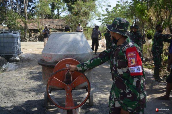 LAMONGAN ,-Satgas TMMD ke-109 Kodim 0812/ Lamongan bersama warga masyarakat saling bahu membahu melaksanakan pengecoran jalan di Desa Tebluru Kecamatan Solokuro Kabupaten Lamongan.