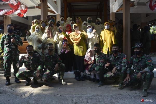 LAMONGAN -Anggota TNI yang tergabung dalam Satuan Tugas (Satgas) TNI Manunggal Membangun Desa (TMMD) ke 109 Kodim 0812/Lamongan bersama masyarakat Ibu ibu PKK Desa Tebluru, Kecamatan Solokuro, Kabupaten Lamongan, tampak terlihat kompak dak harmonis dalam berfoto bersama Seusai acara Tasyukuran HUT TNI ke 75 di Balai Desa Tebluru.
