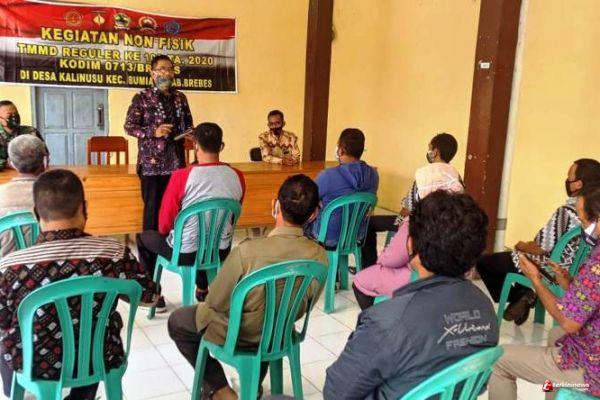 Brebes – Dinas Kesatuan Bangsa dan Politik (Kesbangpol) Kabupaten Brebes, memberikan materi sosialisasi PPBN (Pendidikan Pendahuluan Bela Negara) dan wawasan kebangsaan, di kegiatan non fisik TMMD Reguler 109 Kodim 0713 Brebes, kepada perwakilan warga masyarakat Desa Kalinusu, Kecamatan Bumiayu, Kabupaten Brebes, Jawa Tengah. Rabu (7/10/2020).