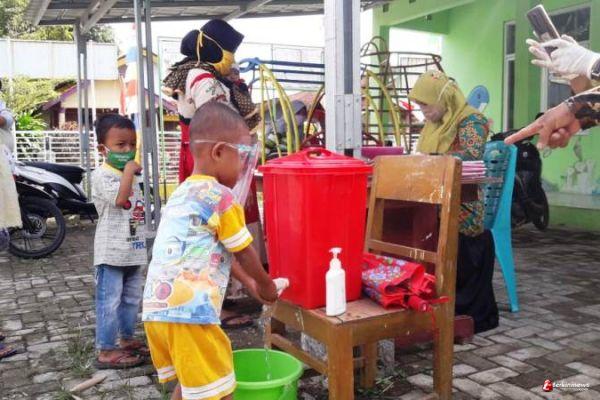 Termasuk di Paud Al Ikhlas Kalinusu, yang terletak satu pagar dengan Balai Desa Kalinusu, juga menerapkan pemakaian masker dan cuci tangan bagi para anak didiknya.