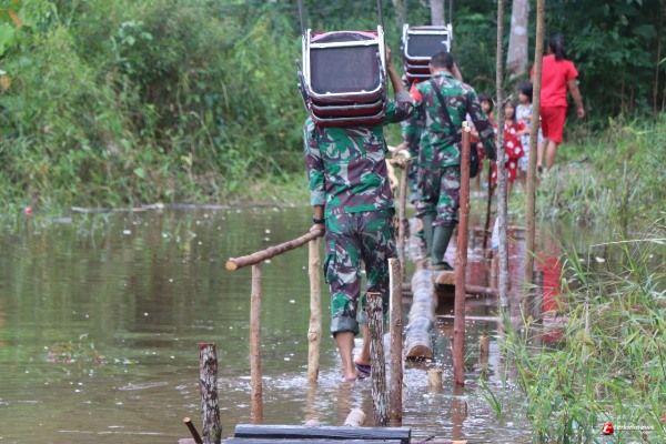 Terlihat dalam gambar, anggota Satgas TMMD 109 Kodim Sintang yang sedang membawa kursi bersama dengan warga menuju balai Desa Tirta Karya, saat melintasi jembatang penyebrangan sementara yang di bangun Satgas TMMD untuk melintas warga sekitar.