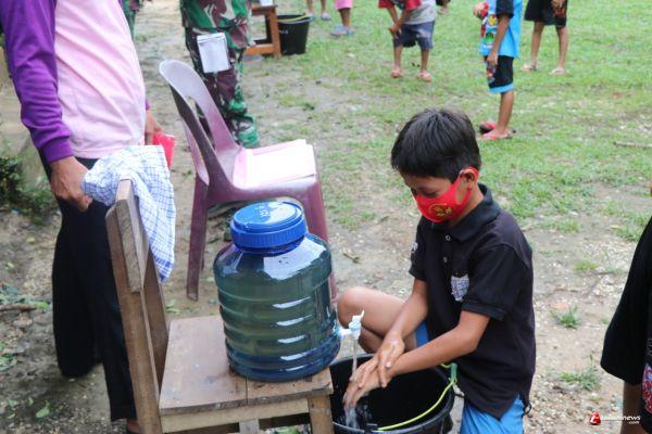"Ayok sini Om ajari kalian cuci tangan yang benar. Sini kumpul," ajak Prada Dorang, pada Rabu (23/09/2020) pagi.