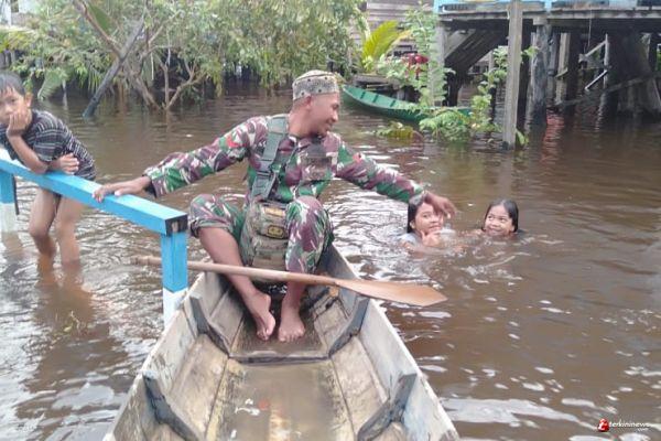 SINTANG - Anggota satgas TMMD Kodim 1205/Sintang rela menerobos banjir demi anak-anak lancar mengaji pada Selasa (29/09/2020).