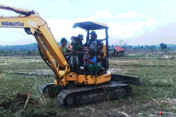 Cerianya Anak-anak Kalinusu Brebes Naik Alat Berat Yang Membangun Jalan Desanya