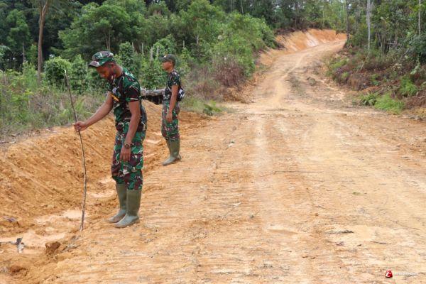 Terlihat Serda Wahyu dengan di temani beberapa anggota Satgas lainnya sedang melakukan pengecekan pada pembuatan berrem jalan yang termasuk salah satu sasaran pembangunan jalan.