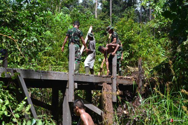 SINTANG - Prada Farizi bersama anggota Satgas TMMD 109 / Sintang lainnya membantu warga membongkar jembatan yang akan di bangun di desa Wira Yuda, yang berdekatan dengan Desa Tirta Karya, Kecamatan Ketungau, Kabupaten Sintang, Kalimantan Barat, Rabu (30/09/2020).