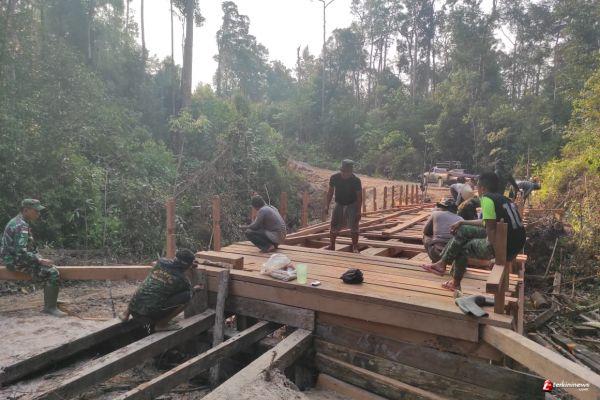 SINTANG – Kegiatan bergotong royong bersama warga Desa Trita Karya, Kecamatan Ketungau Tengah, Kabupaten Sintang, Kalimantan Barat, Sabtu (10/10/2020), dalam mengerjakan kegiatan fisik TMMD 109 Kodim Sintang.