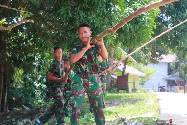 Dengan memanfaatkan bahan yg tersedia dihutan berupa kayu, Prada Yulius terlihat sedang memindahkan kayu yg akan digunakan untuk pembangunan gereja dengan cara dipikul bersama dengan rekan rekannya.