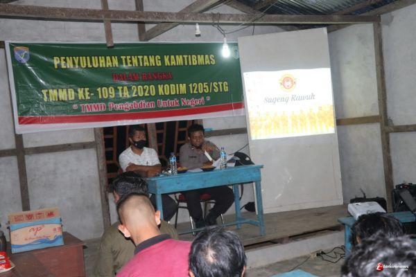 SINTANG - Iptu Ginting dari Polsek Nanga Marakai, menjadi nara sumber Penyuluhan soal Kamtibmas sebagai pelaksanaan program pembangunan non fisik TMMD 109 / Sintang, bertempat di Balai desa Tirta Karya, Selasa (6/10/2020) malam.