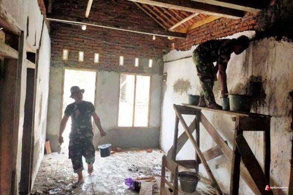 Brebes – Pekerjaan rehab RTLH (Rumah Tidak Layak Huni) program TMMD Reguler 109 Kodim 0713 Brebes, milik Damad (33), warga Dusun Karanganyar RT. 02 RW. 01, Desa Kalinusu, Kecamatan Bumiayu, Kabupaten Brebes, Jawa Tengah, melanjutkan plester dinding dalam dan luar rumah. Minggu (11/10/2020).