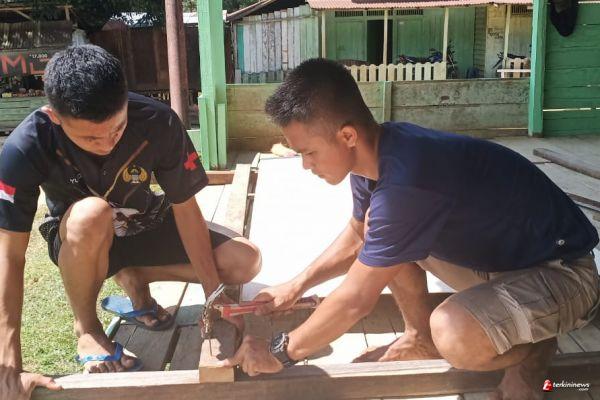 Anggota Satgas TMMD 109 / Sintang, yaitu Prada Dwiki bekerja demi kesiapan maksimal mungkin melakukan penyambutan, meski panas terik matahari sangat menyengat di Haari Minggu (11/10/2020).
