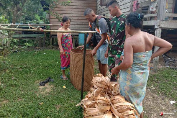 SINTANG - Bu Inah Warga Desa Tirta Karya, Kecamatan Ketungau, Kabupaten Sintang, Kalimantan Barat, memberikan hadiah berupa tikar kepada Serda Yudho, Salah Satu Anggota Satgas TMMD 109 / Sintang, Minggu (11/10/2020).