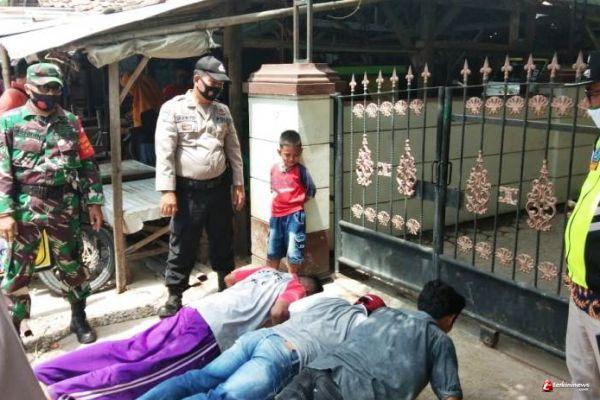 Tampak tim tersebut memberikan sanksi edukasi kepada para pengunjung Pasar Bumiayu, Kecamatan Bumiayu, Kabupaten Brebes, berupa push up sebanyak 20 kali. Senin (11/10/2020).