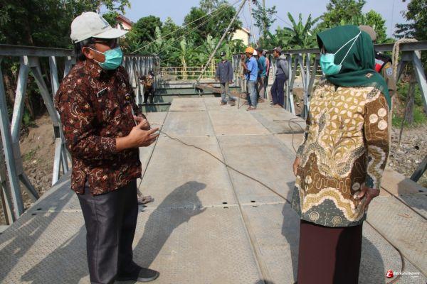 TEGAL – Bupati Tegal Umi Azizah bersama Kepala Dinas Pekerjaan Umum Kabupaten Tegal Hery Suhartono meninjau langsung pemasangan Jembatan Bailey Kali Kemiri sepanjang 30 meter di Desa Kupu, Kecamatan Dukuhturi, Kabupaten Tegal, Kamis (08/10/2020) sore. Pemasangan tersebut merupakan upaya perbaikan yang dilakukan pemerintah akibat terputusnya Jembatan Kali Kemiri yang disebabkan oleh derasnya arus sungai, Minggu (10/01/2020) lalu.